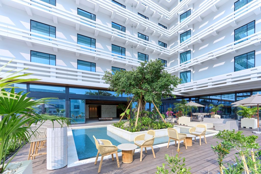 The hotel’s terrace and pool area, framed by lush greenery, provide a tranquil counterpoint to the surrounding urban landscape. By day, the openness of the Okinawan sky dominates; by night, soft illumination and subtle Ryukyuan melodies transform the space into a calm, almost meditative setting.